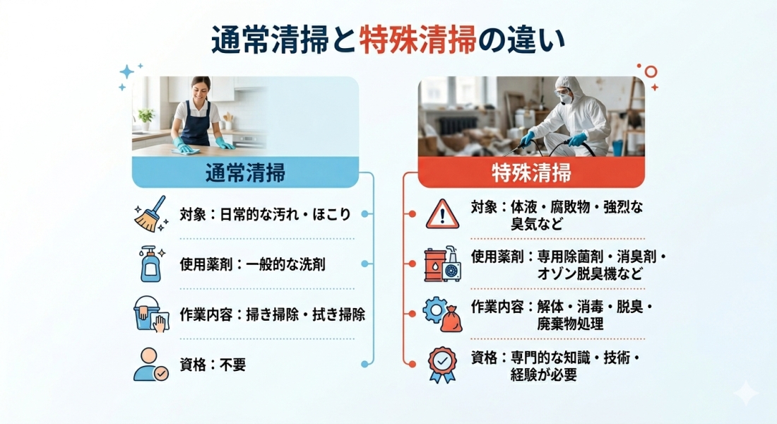 通常の清掃と特殊清掃の大きな違いは、対処すべき問題の深刻度にあります。