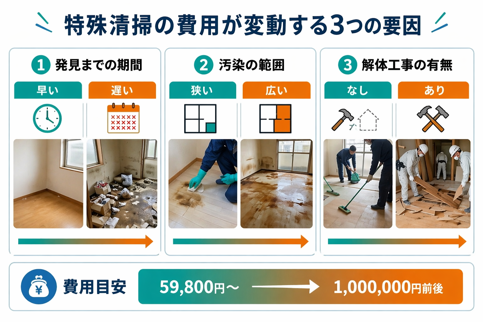 特殊清掃の事例でご紹介したように、同じ「孤独死」であっても、発見までの期間や汚染の広がり方によって、数万円で済む場合もあれば、100万円近くになるケースもあります。ここでは、費用の目安と金額が変動する主な要因をまとめました。
