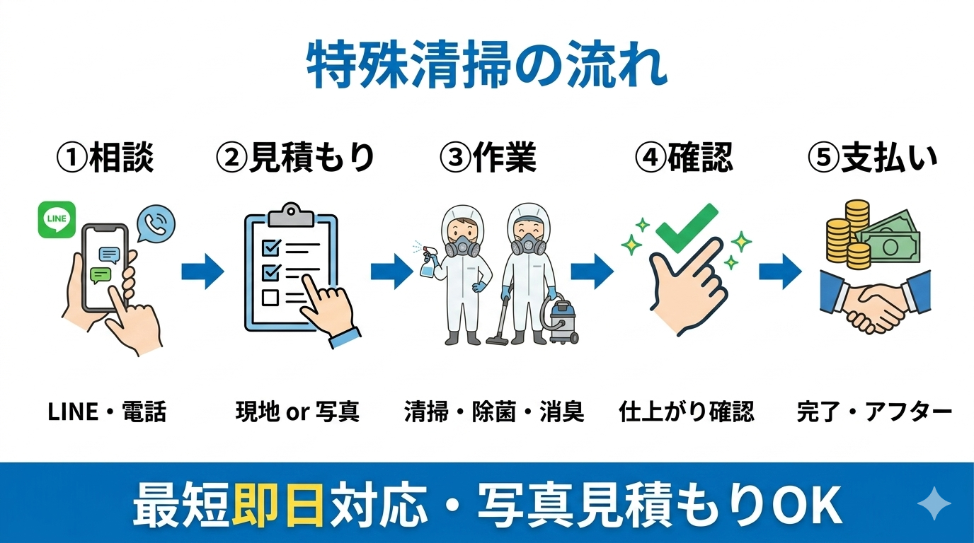 特殊清掃について「どのような流れで進むのか分からない」と不安に感じる方も多いのではないでしょうか。