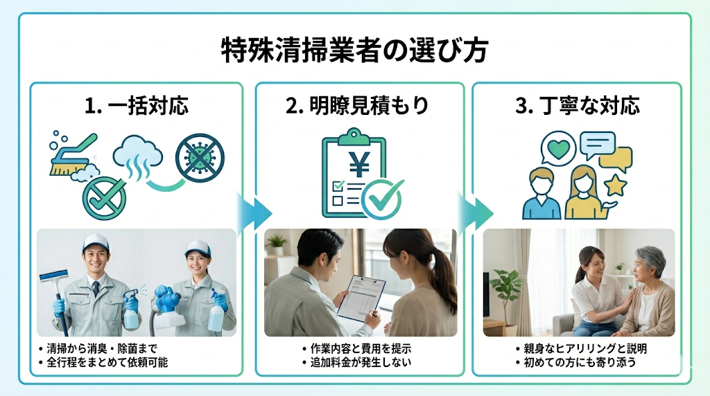 清掃・消臭・除菌を一貫して対応できる業者かどうかが重要です。