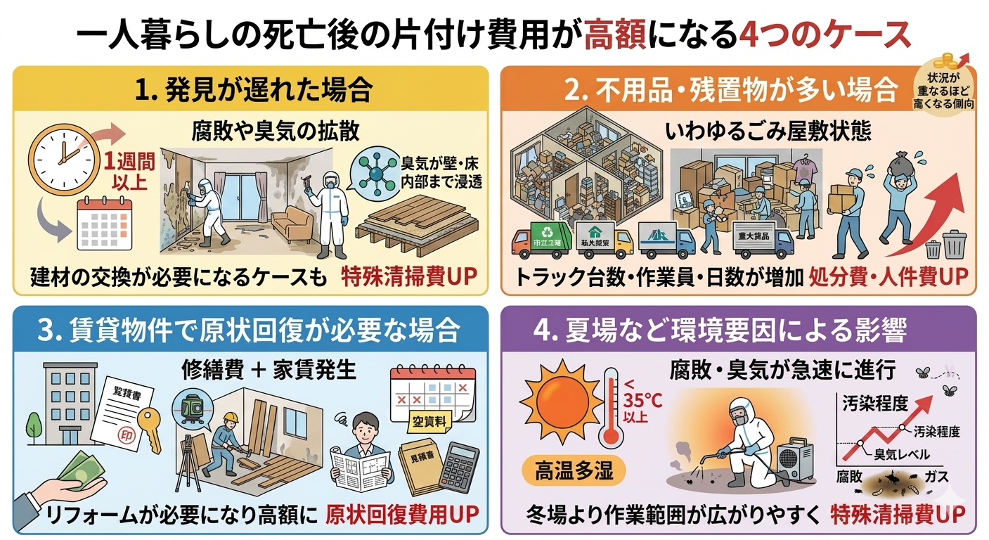 一人暮らしの方がお亡くなりになった後の片付け費用は、状況によって大きく変わります。