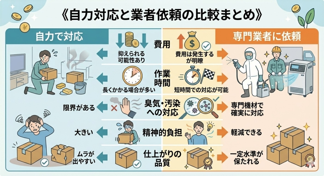 ここでは、自力で対応する場合と専門業者に依頼する場合の違いを整理します。