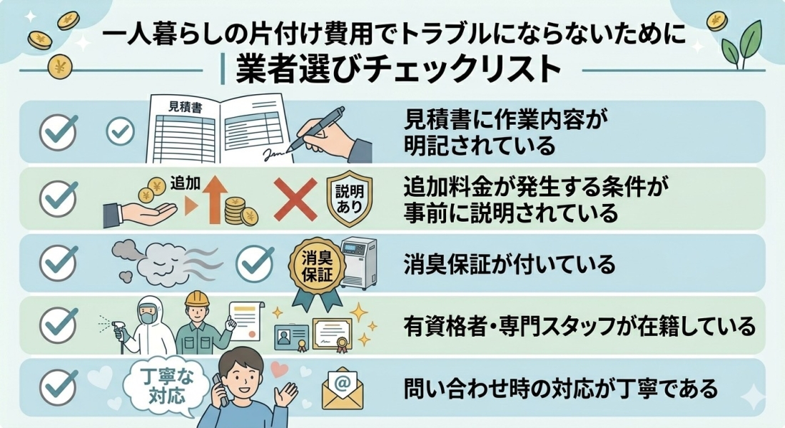 一人暮らしの片付け費用でトラブルにならないために|業者選びチェックリスト