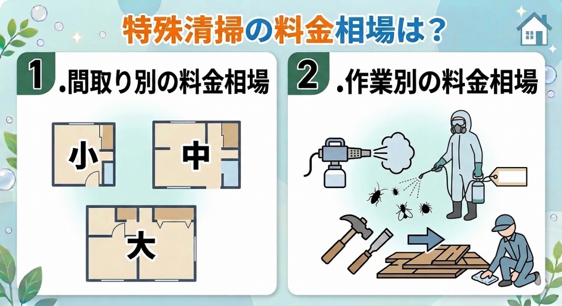 特殊清掃の料金相場は、間取りや現場の状況によって7万〜60万円以上と幅が広く、現場の汚染度合いや必要な作業内容によって対応範囲が異なります。