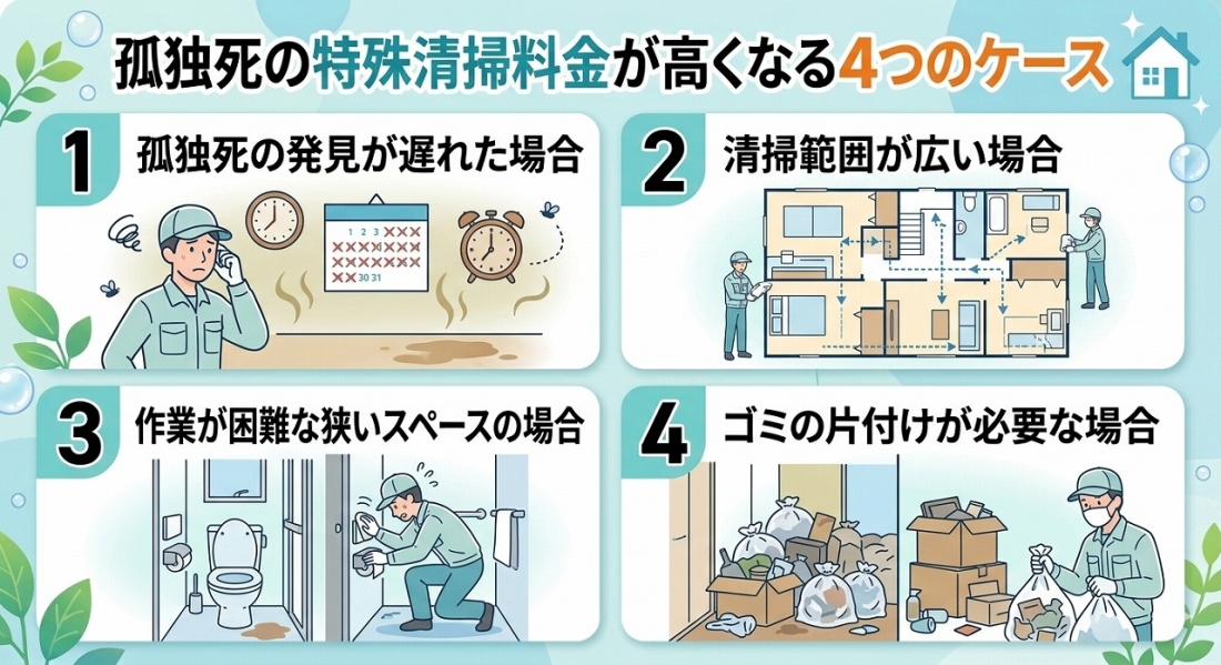 特殊清掃費用に加えてゴミの撤去・廃棄物処理費用が上乗せされるため、総額が高くなります。