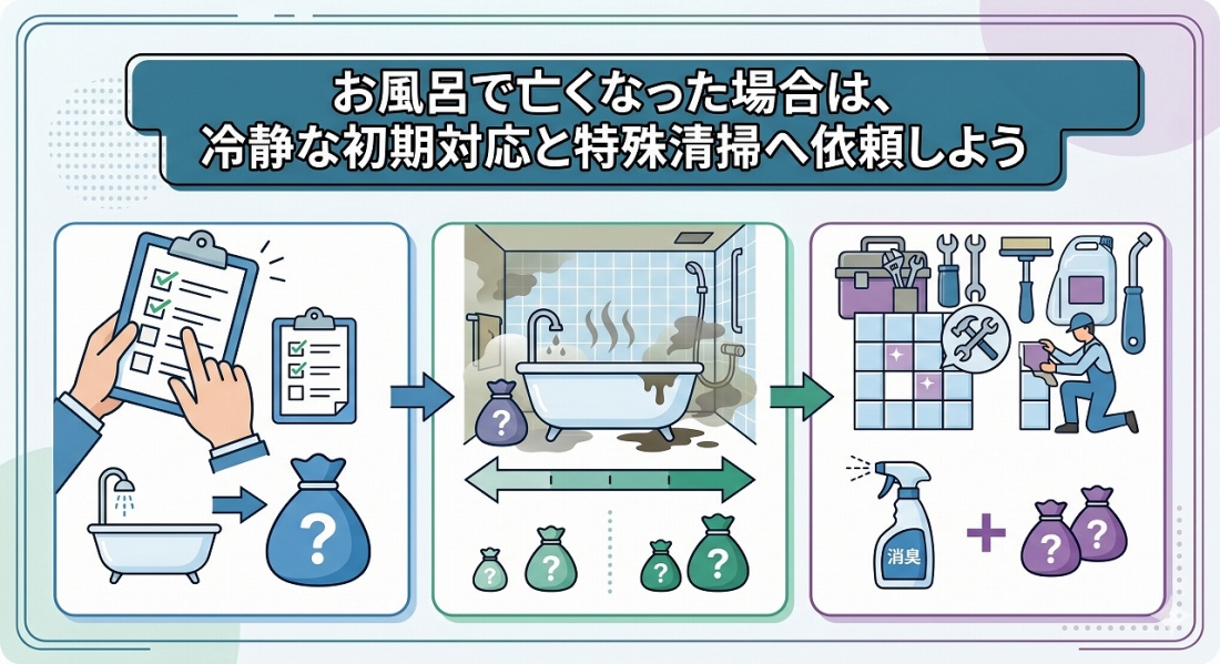お風呂で亡くなった場合は、冷静な初期対応と特殊清掃への依頼が先決