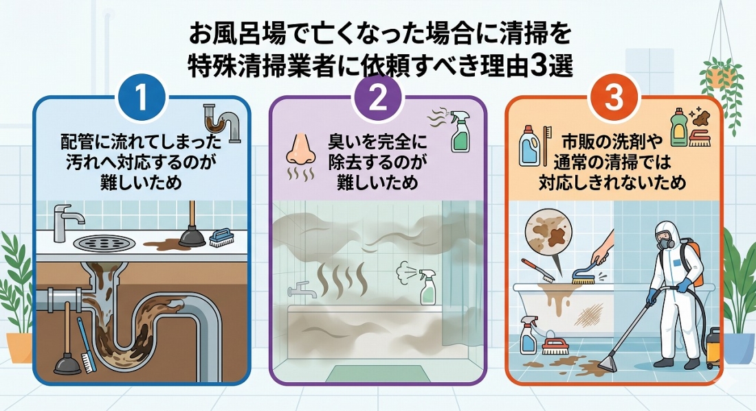 浴室の死亡事案において、特殊清掃業者への依頼が必要な理由は大きく3つあります。