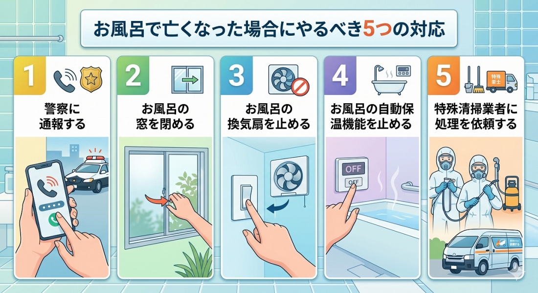 お風呂で人が亡くなった場合にまずすべきことは、警察への通報、そして窓を閉める・換気扇を止める・保温機能を切るという3つの初期対応です。
