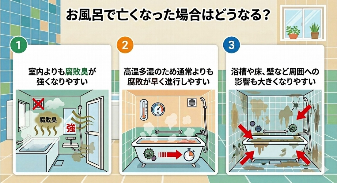 浴室での死亡事案は、室内での孤独死と比べても汚染や腐敗の進行が深刻になりやすい傾向があります。