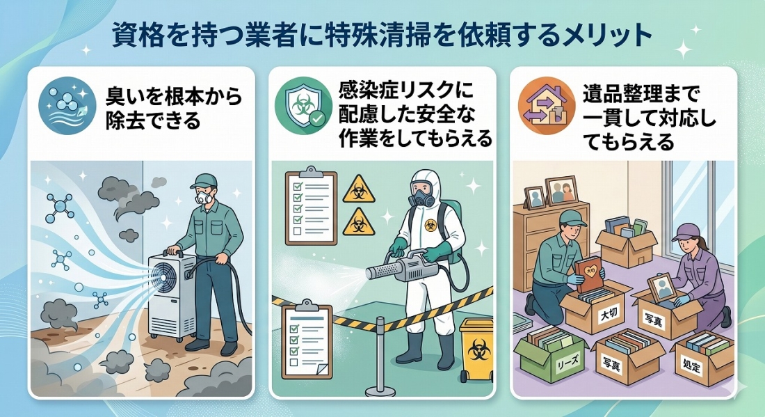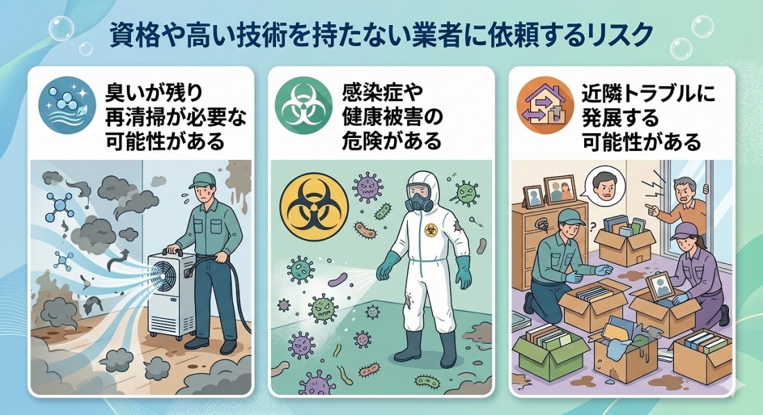 業者選びの際には、費用だけでなく、保有資格・消臭保証の有無・対応範囲を総合的に比較し、信頼できる業者を選ぶことが後悔しない選択につながります。