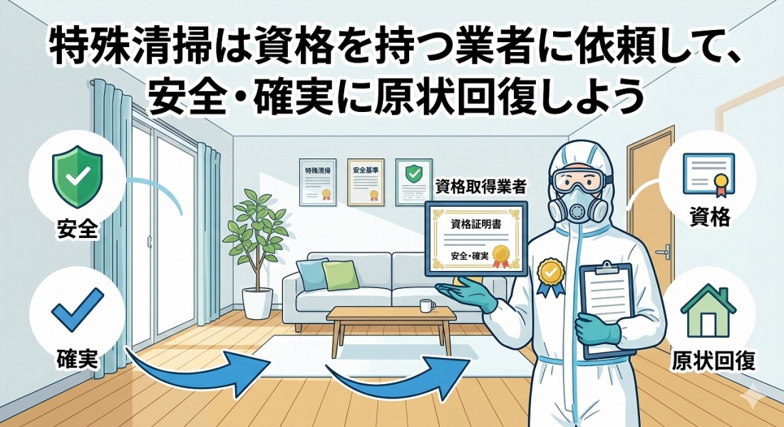 「特殊清掃に資格は必要なの?」「資格のない業者に頼んでも大丈夫?」と不安に感じる方もいるでしょう。